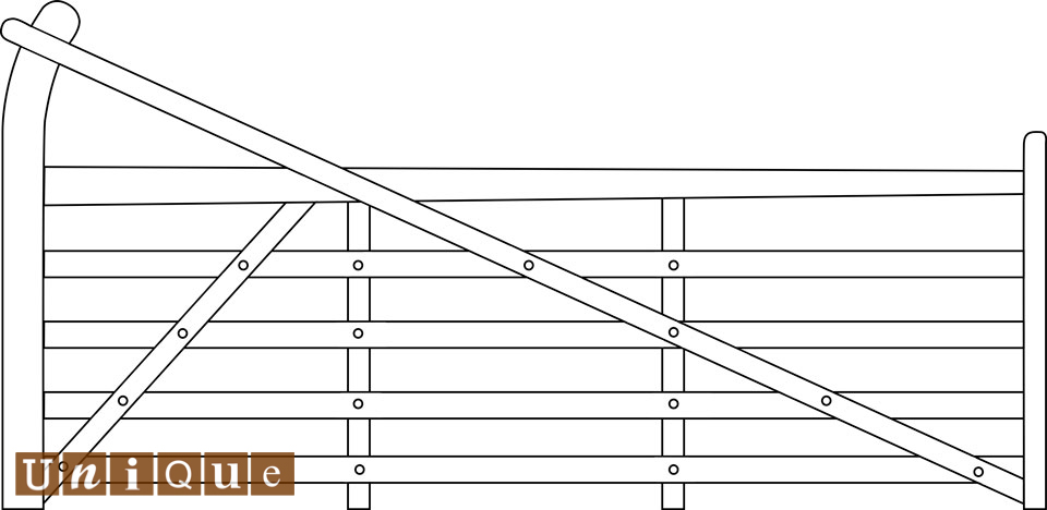 This imposing 5 Bar field gate with its large hand cut and shaped detailed hanging stile and tapered top bar is a very popular and classic design.