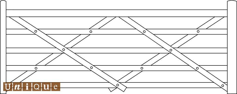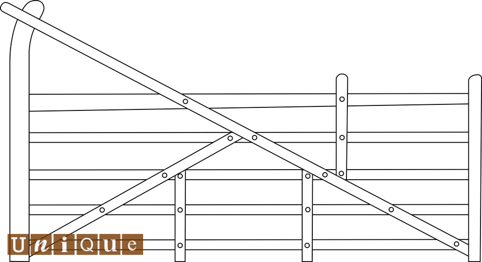 The Dedham Entrance Gate is a 5 bar field gate with a modern twist on its design its additional vertical and extended diagonal bracing adding to not only its design but it also aids with its reinforcing. The Dedham Entrance Gate also features a large hand cut and shaped detailed hanging stile and tapered top bar.